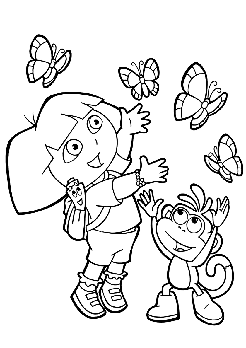 Даша-путешественница распечатать раскраску - Даша и Башмачок ловят бабочек Даша и Башмачок ловят бабочек