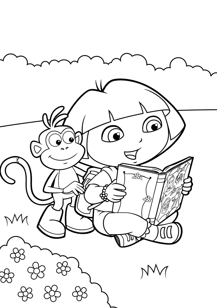 Даша и Башмачок читают книгу распечатать раскраску - Даша-путешественница Даша и Башмачок читают книгу