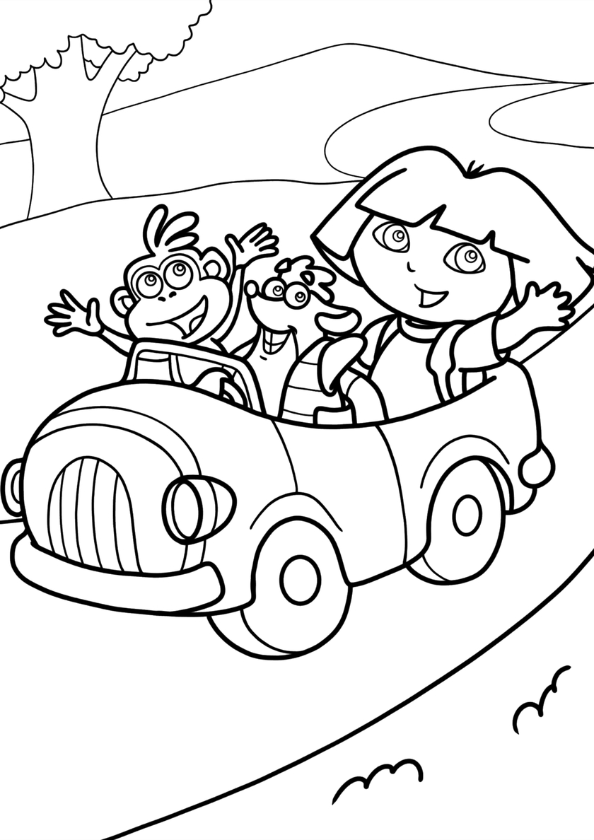 Раскраска Даша с друзьями на машине распечатать на А4 - Даша-путешественница Даша с друзьями на машине