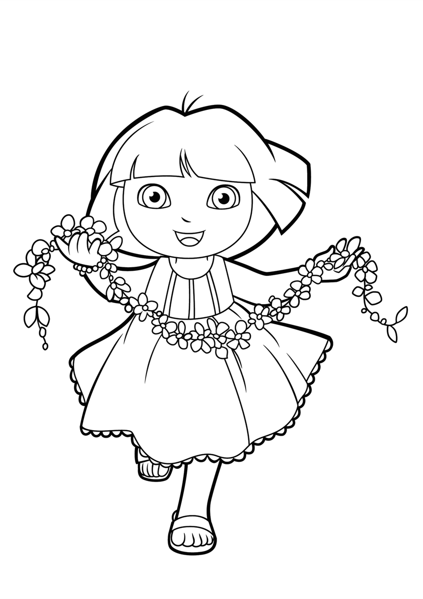 Даша-путешественница бесплатная раскраска распечатать на А4 - Даша с цветочной гирляндой Даша с цветочной гирляндой