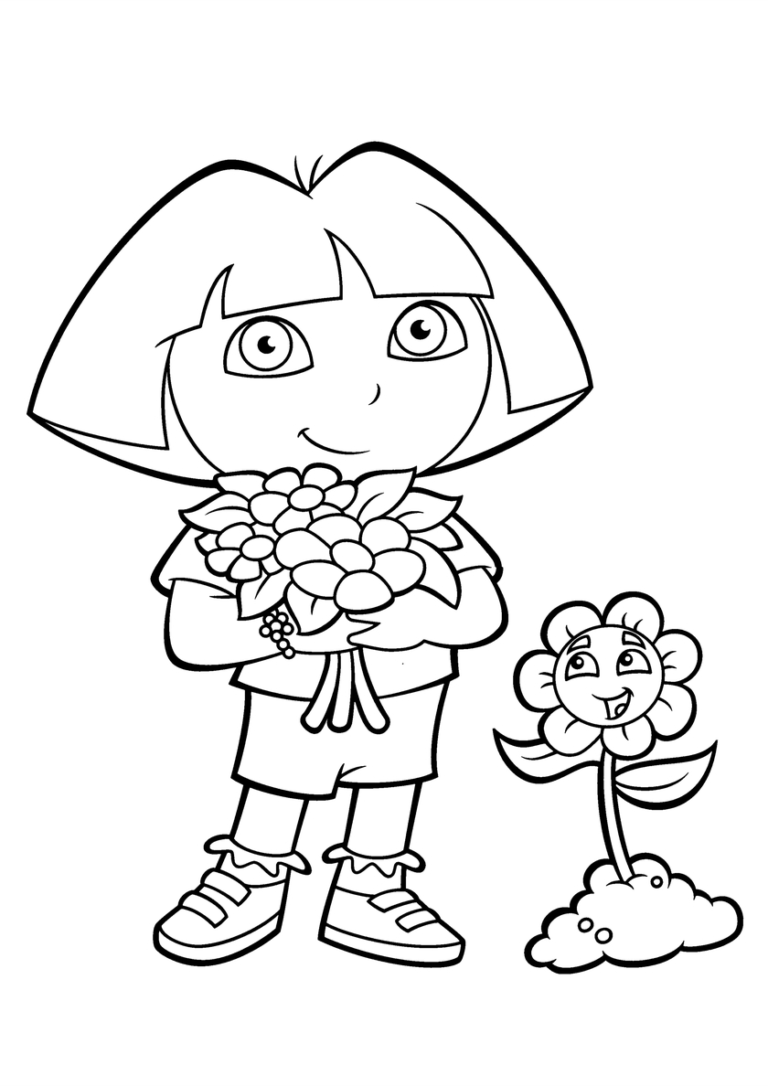 Даша-путешественница с букетом (Даша-путешественница) бесплатная раскраска Даша-путешественница с букетом
