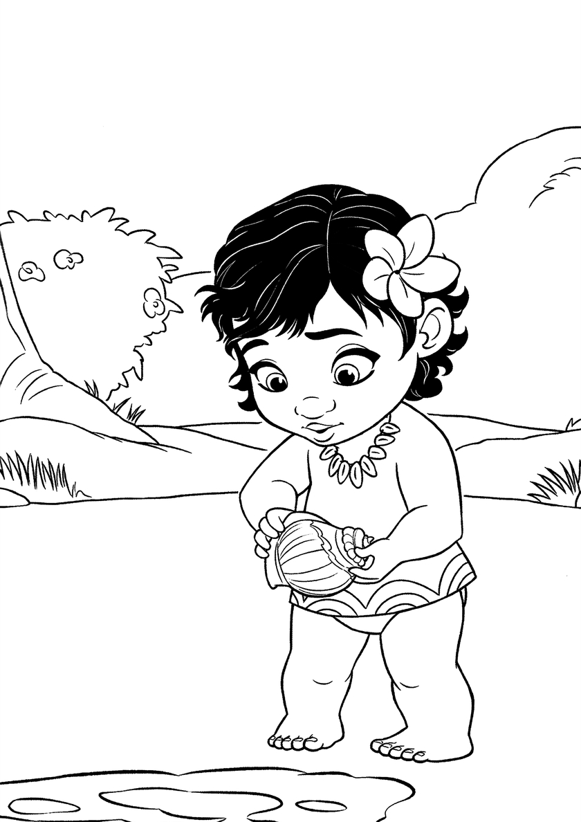 Моана распечатать раскраску - Малышка Моана на берегу Малышка Моана на берегу