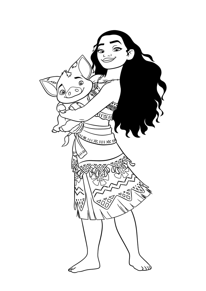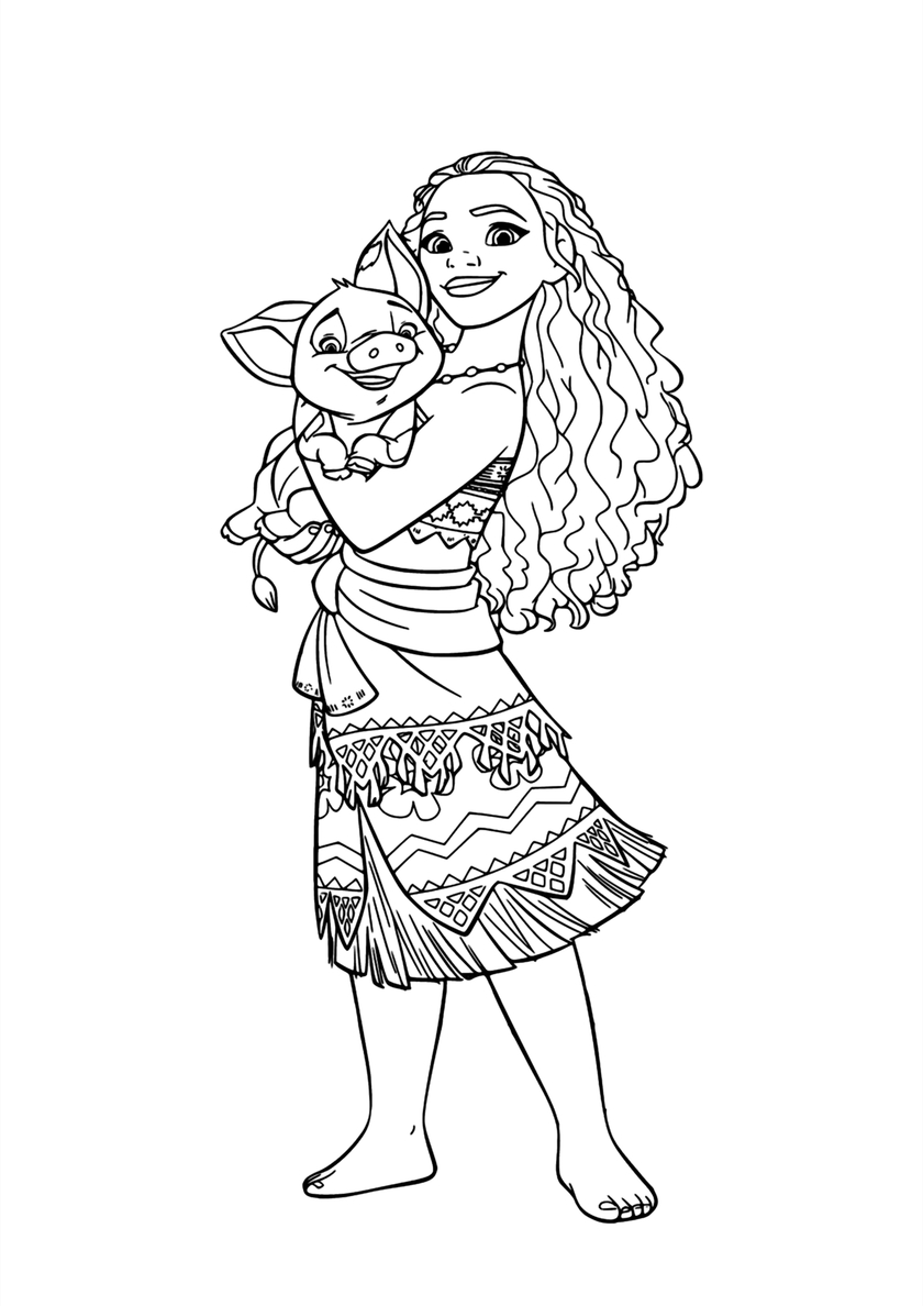 Моана с поросёнком на руках бесплатная раскраска - Моана Моана с поросёнком на руках