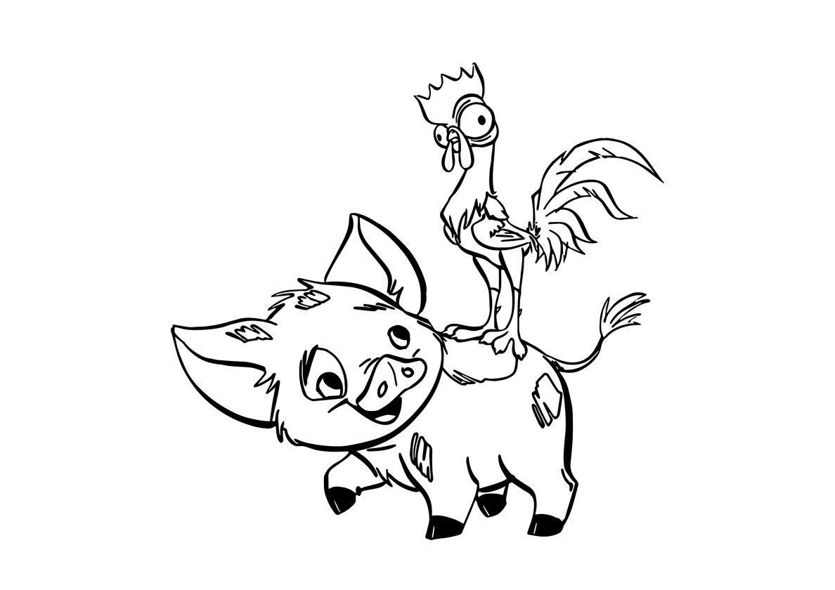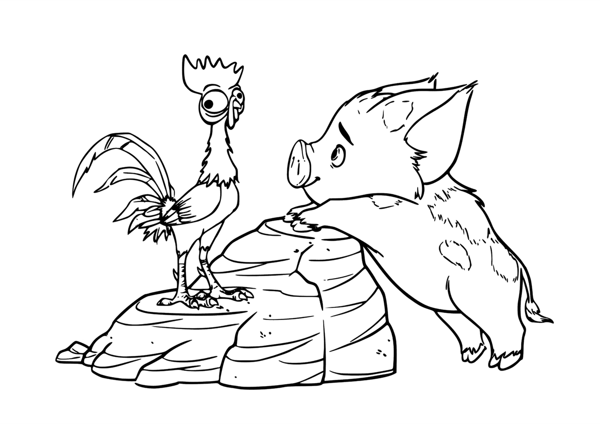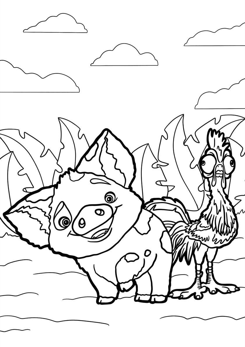 Моана распечатать раскраску на А4 - Хей-Хей и Пуа на прогулке Хей-Хей и Пуа на прогулке