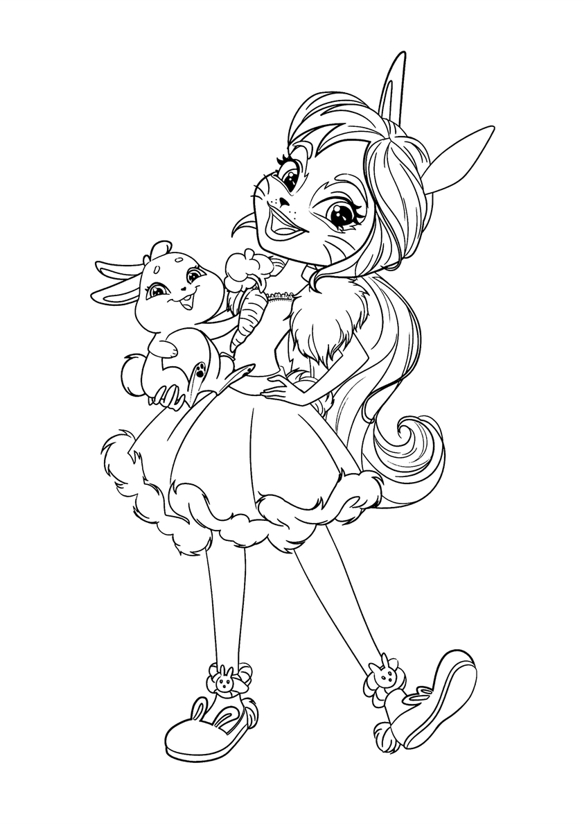 Разукрашки с куклами данной серии игрушек интересны нестандартным подходом. Каждый герой Enchantimals — гибрид человека и животного (своего питомца), в волшебном лесу легко встретить девушку с заячьими ушами или смешными оленьими рожками.