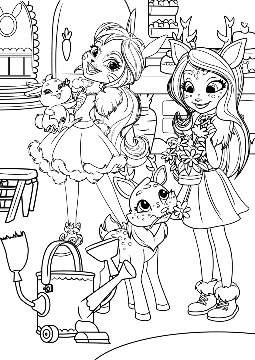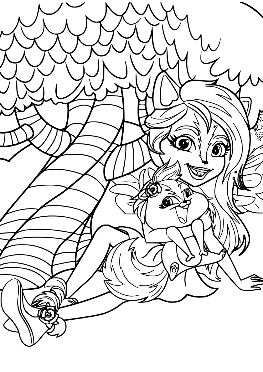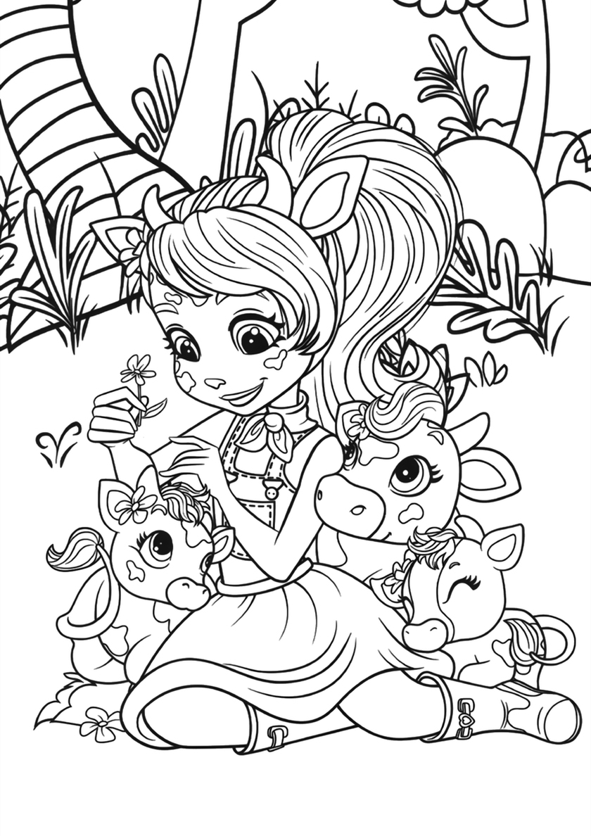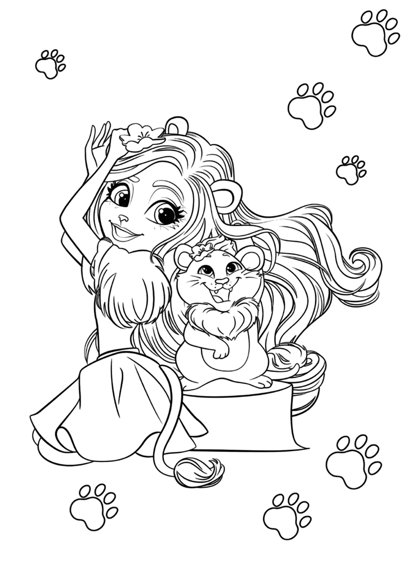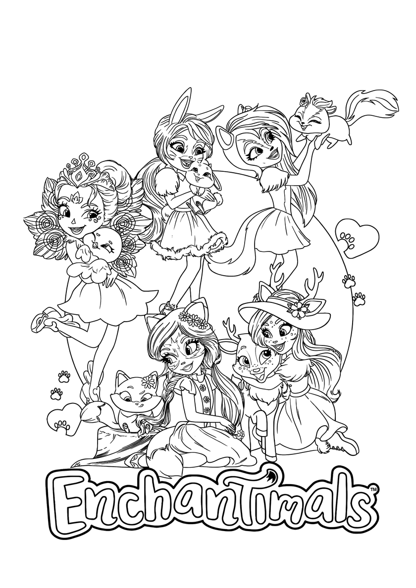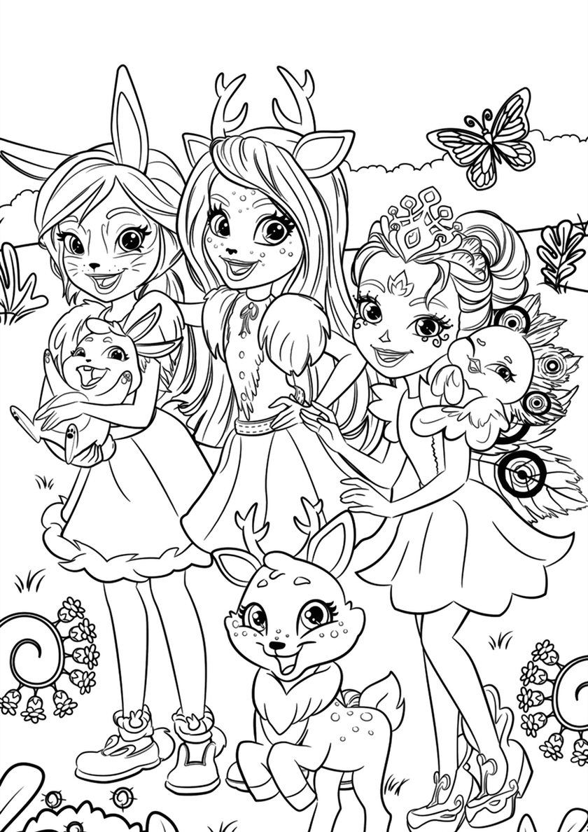 Среди раскрасок с модельными куклами Enchantimals и их питомцами Вы найдете: