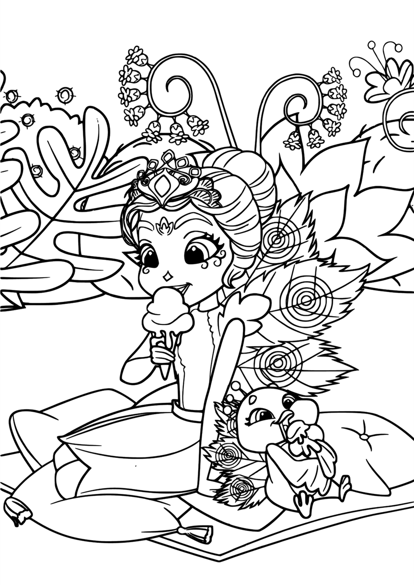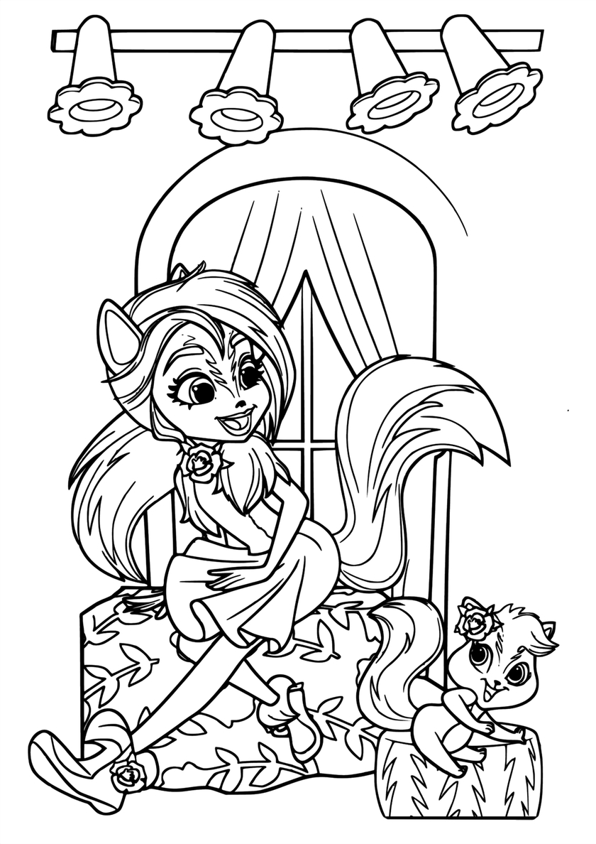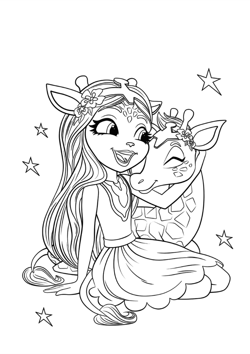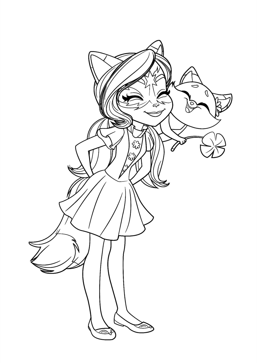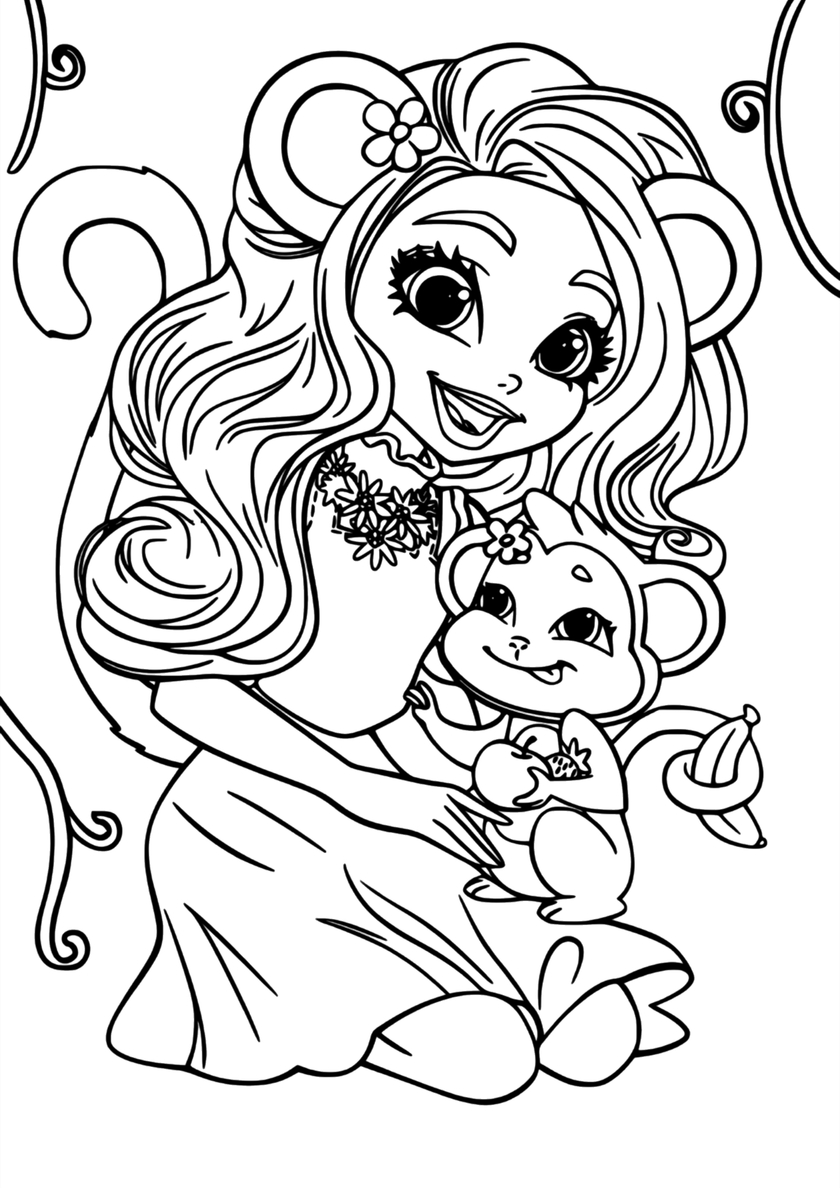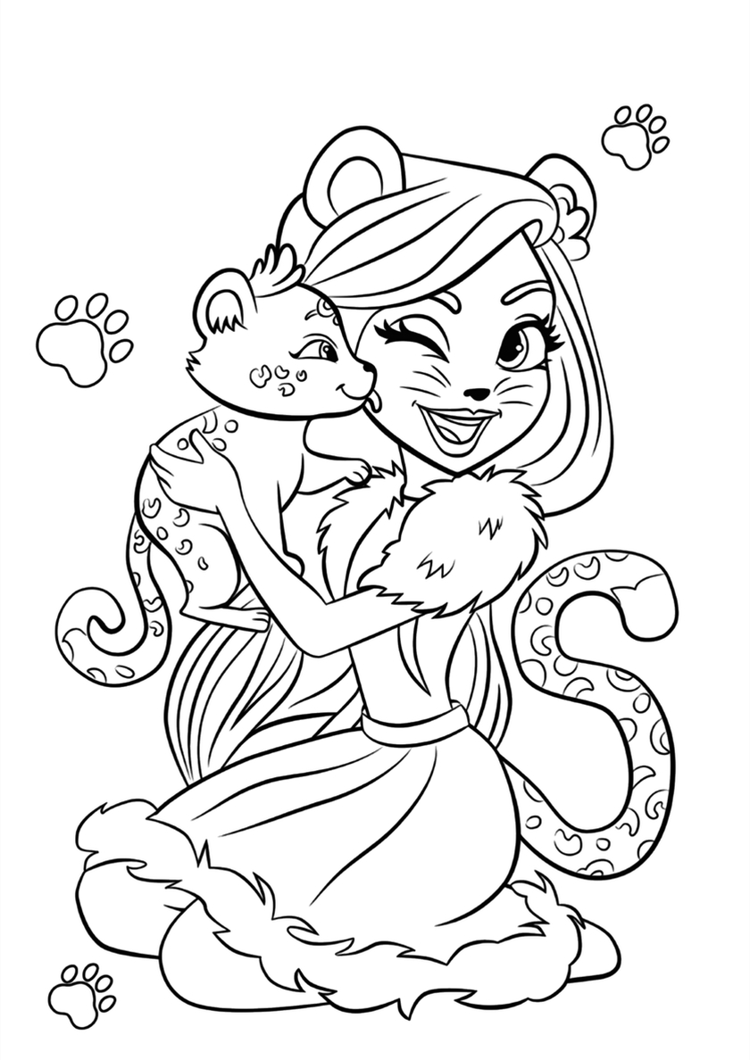 Среди раскрасок с модельными куклами Enchantimals и их питомцами Вы найдете: