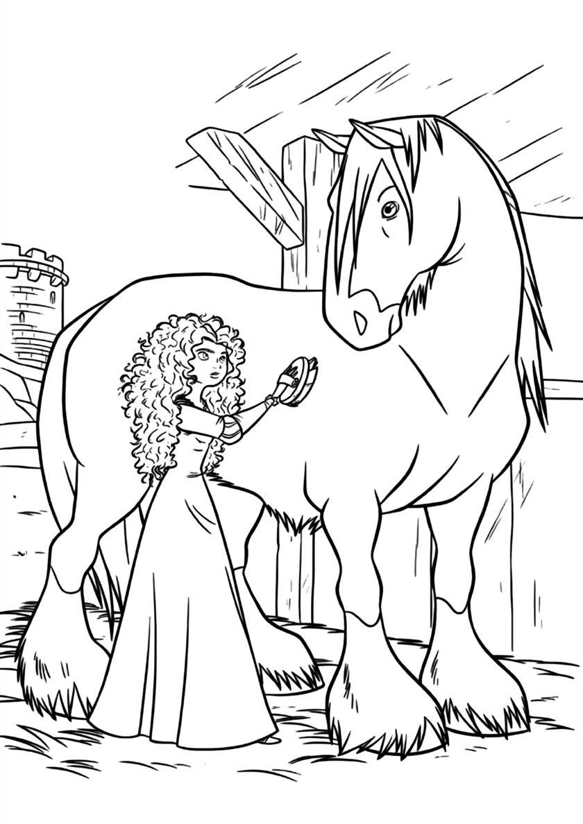Бесплатная раскраска Мерида ухаживает за конём - Мерида Мерида ухаживает за конём