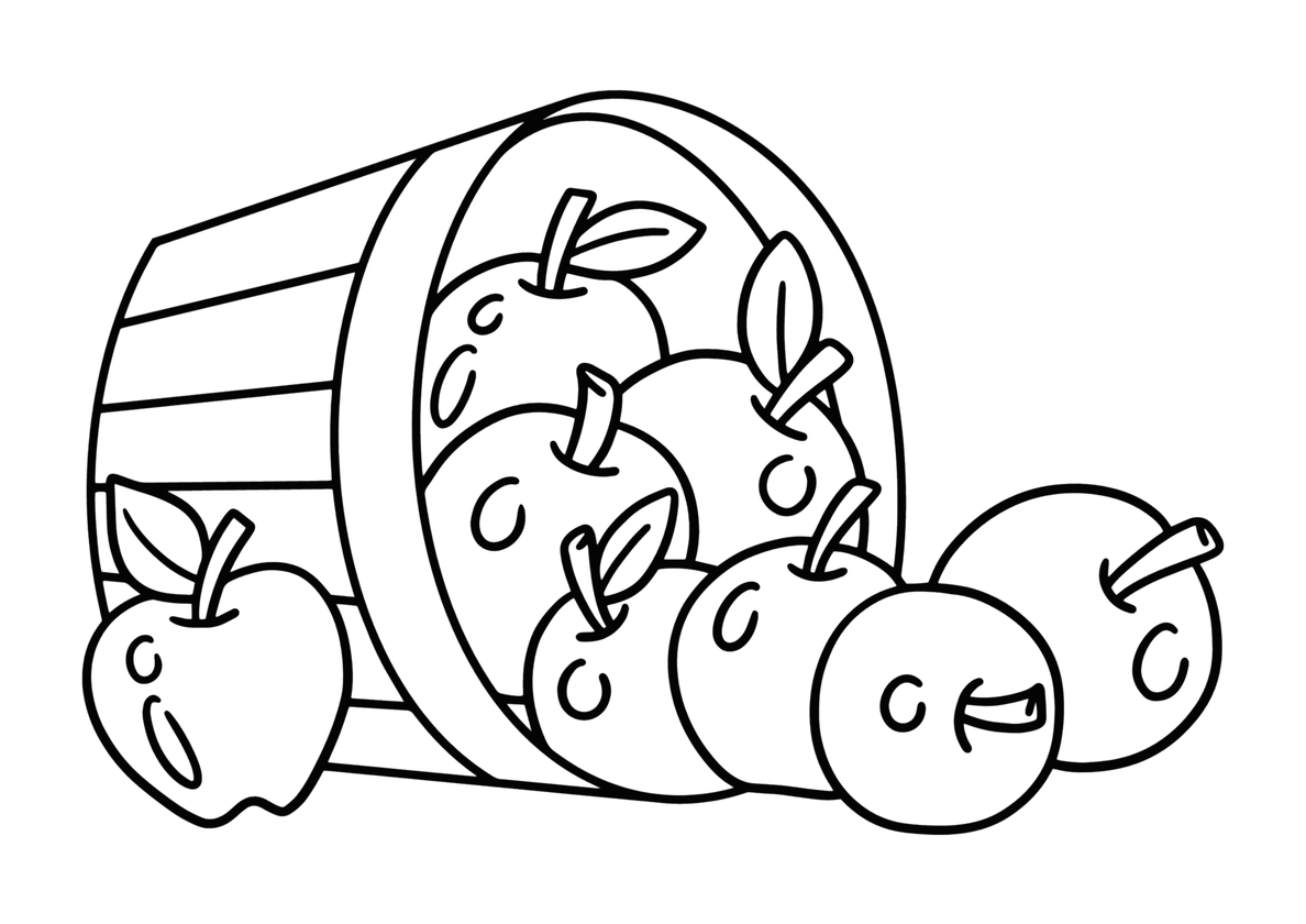 Раскраска Упавшая корзинка с яблоками распечатать на А4 - Яблоко Упавшая корзинка с яблоками