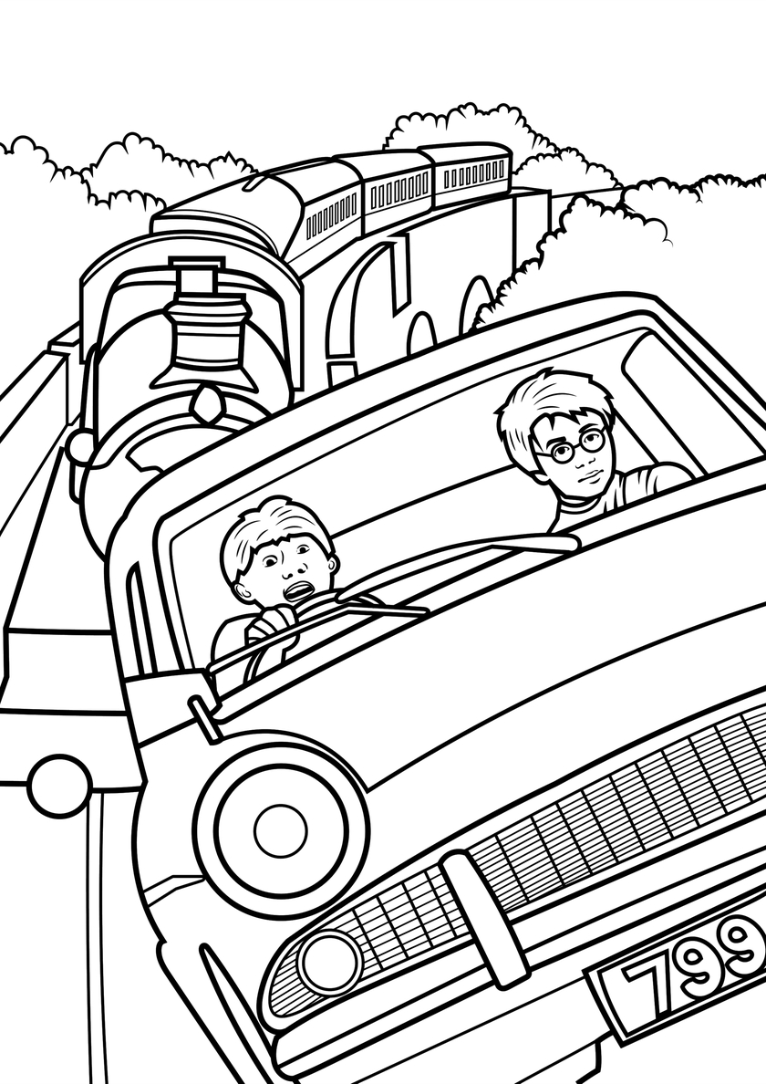 Гарри и Рон на летающей машине - Гарри Поттер бесплатная раскраска Гарри и Рон на летающей машине
