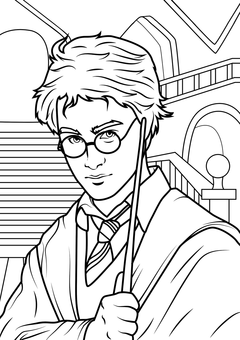 Гарри Поттер в школьном холле разукрашка скачать и распечатать - Гарри Поттер Гарри Поттер в школьном холле