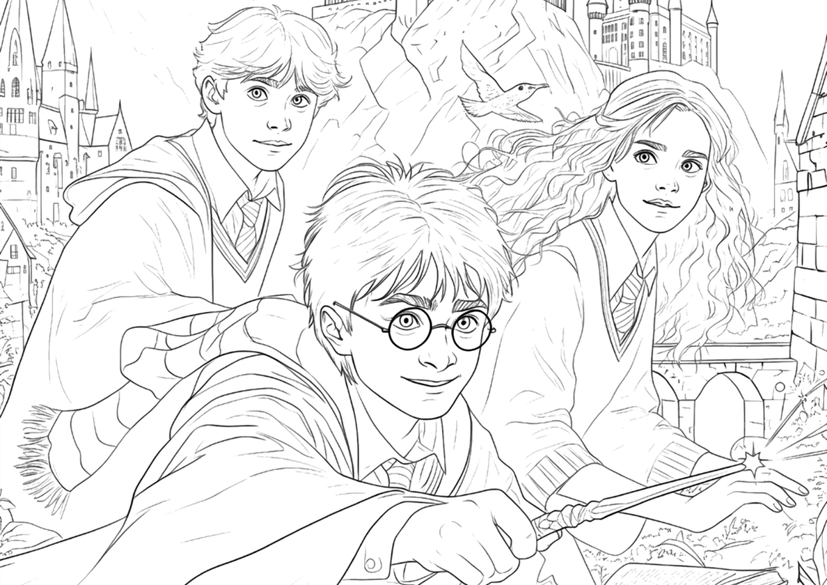 Смелые волшебники - Гарри Поттер раскраска распечатать на А4 Смелые волшебники