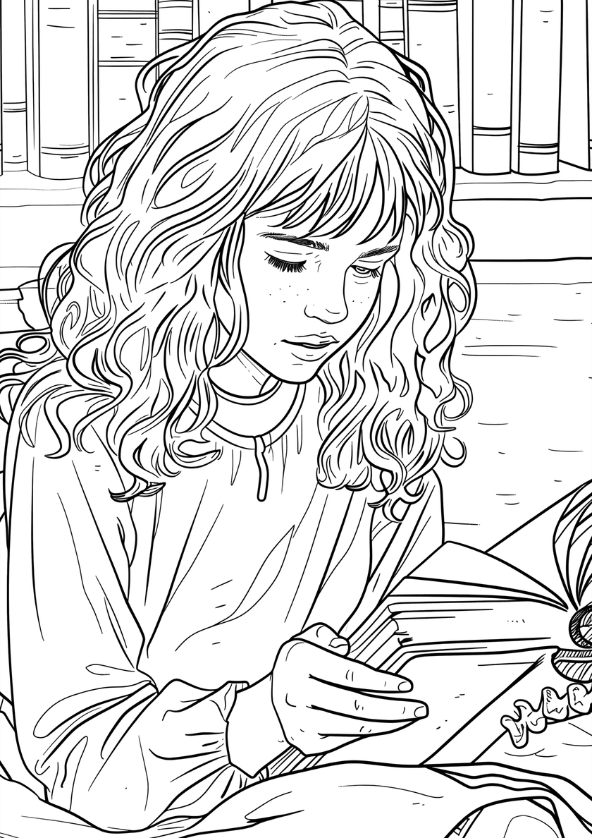 Разукрашка Гермиона среди книг распечатать и скачать - Гарри Поттер Гермиона среди книг