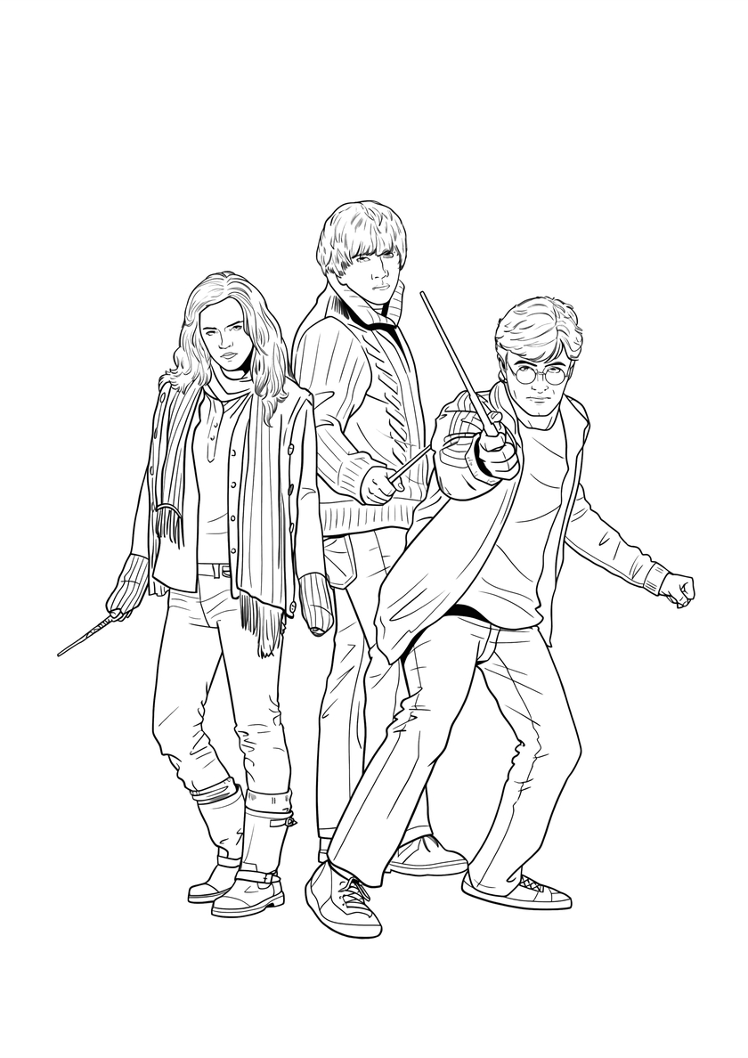 Гарри, Рон и Гермиона - Гарри Поттер распечатать раскраску на А4 Гарри, Рон и Гермиона